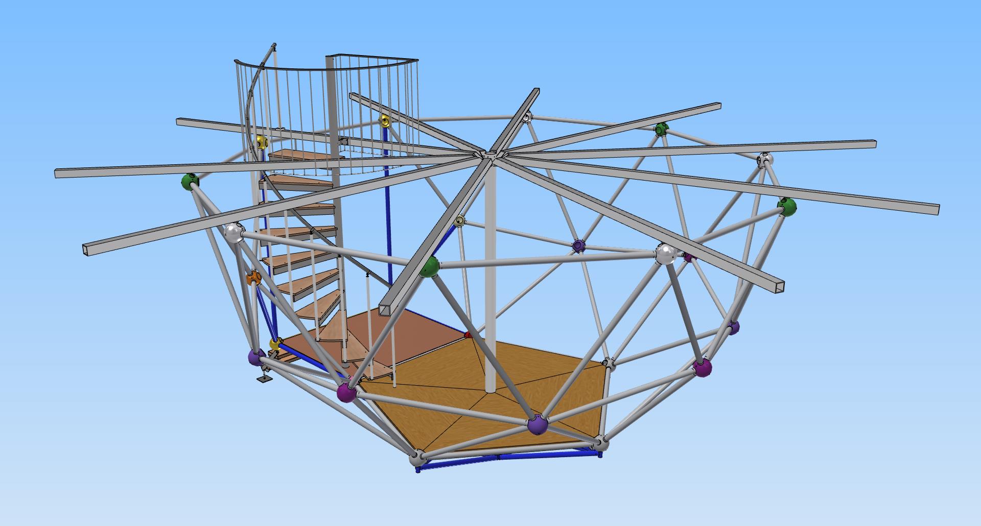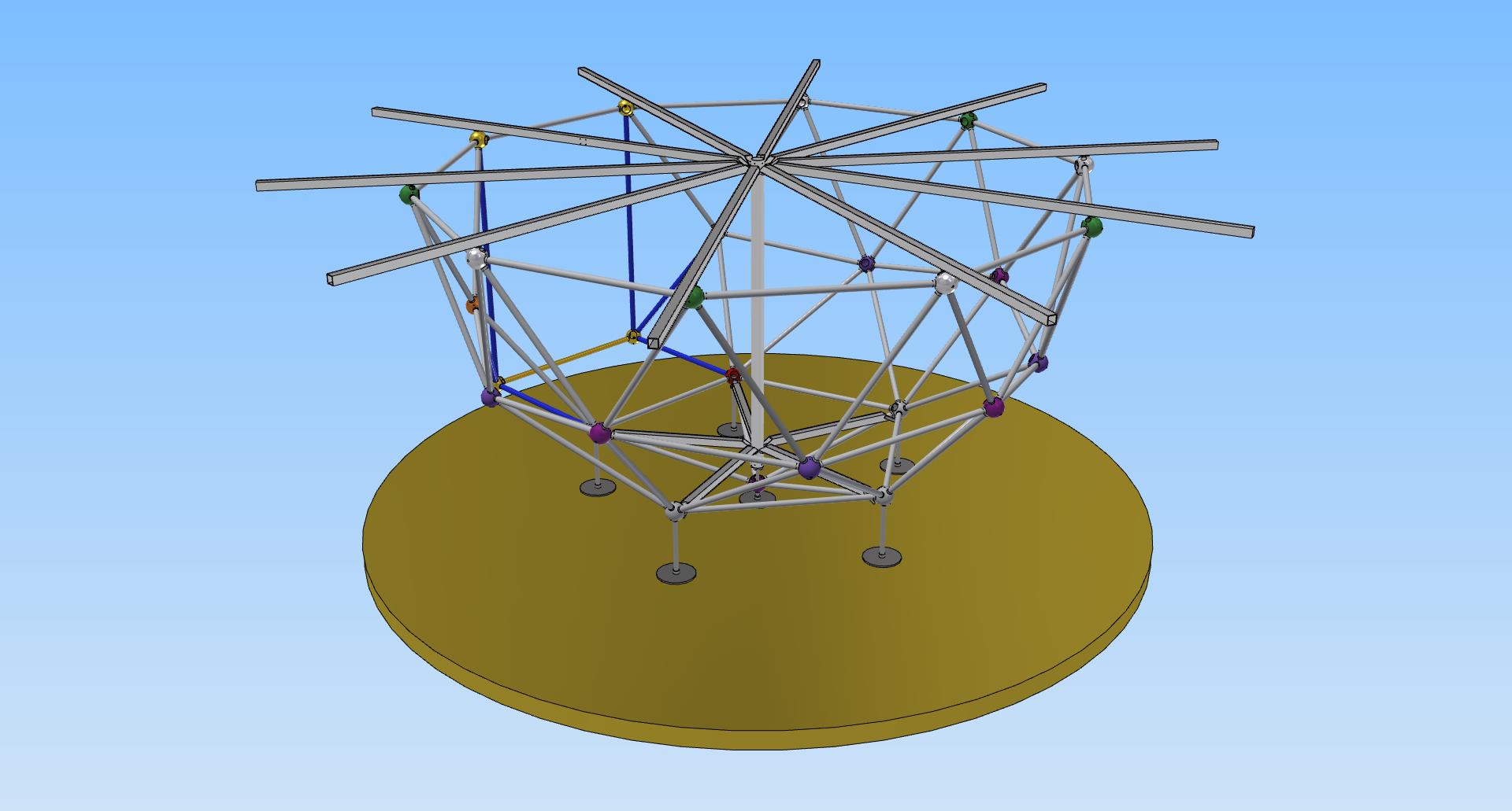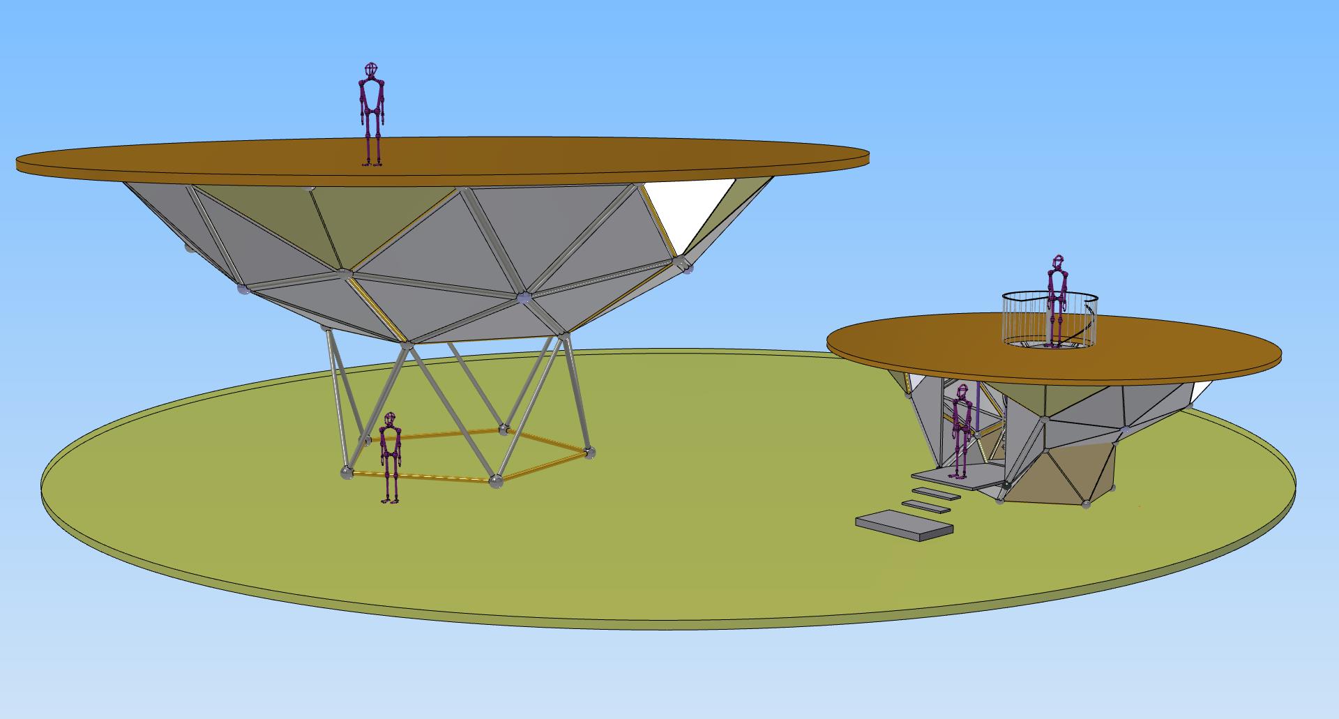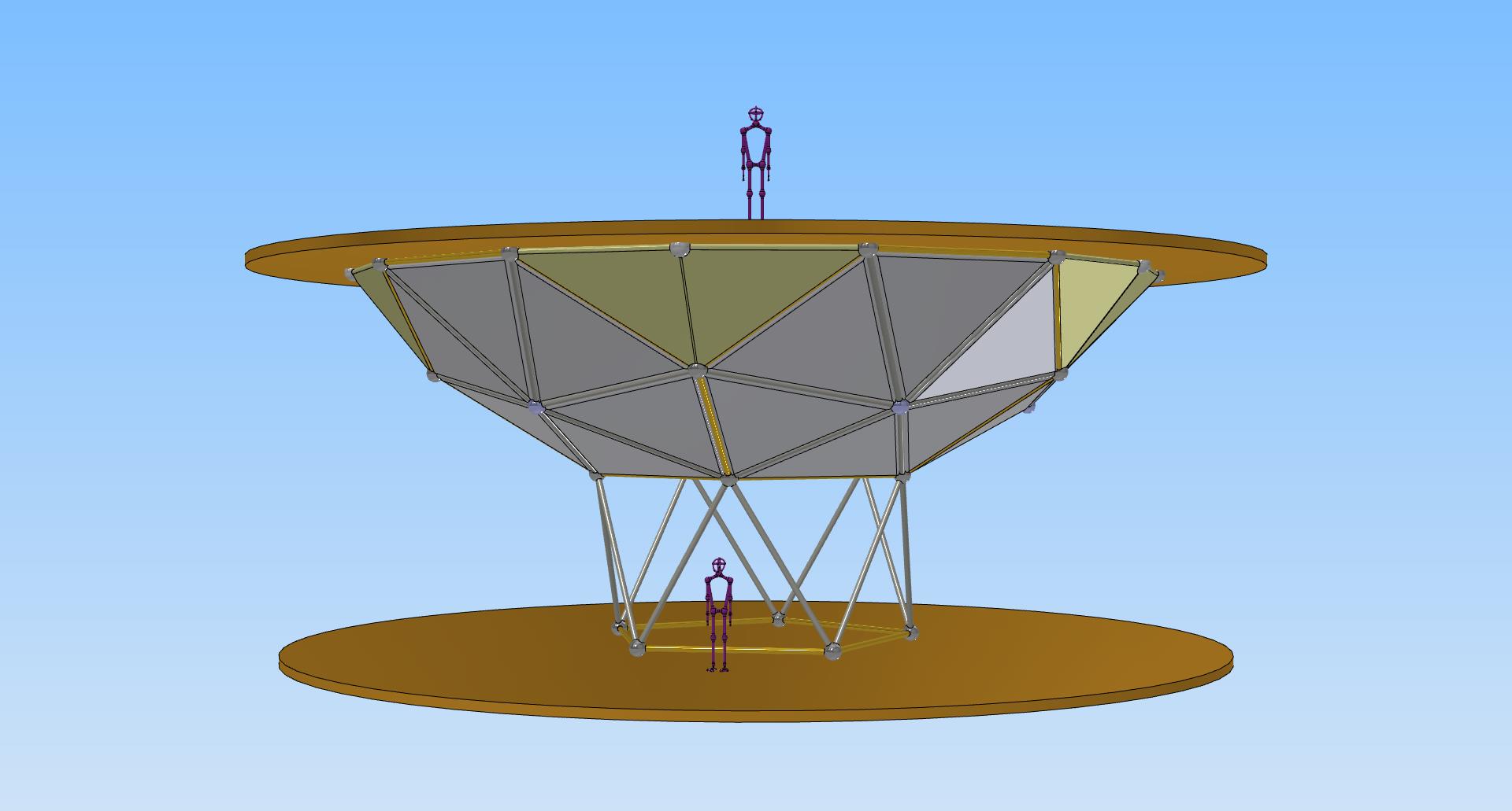 My building system, “the sphere of OZ”, a tool that I have conceived and designed for erecting a geodesic sphere is eminently suitable for a construction of most any other type of a building/structure. One among them is a “dish”, an inverted geodesic dome, designed to serve as a foundation/platform to carry a yurt, a “glamping” dome or a tent, and it is intended especially for an environment where the terrain is uneven, hilly or wet, under which conditions the current/conventional wood platforms/decks are usually more hassle and expense than the yurts them selves, while the dish is simultaneously providing an additional living, storage, utility space. There will be no need for a ground clearing, excavation and on site construction work to install the dish foundation/platform other than making room and anchor it by means that will be determined during the design stages.